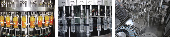 本系列生產(chǎn)線集洗瓶、灌裝、封蓋、套標(biāo)、包裝為一體,適用于各種果汁飲料、茶飲料的熱灌裝生產(chǎn),同時更換少量的零部件,便可用于純凈水、礦泉水的灌裝。采用先進(jìn)的常壓重力式灌裝原理,灌裝快、穩(wěn)、準(zhǔn),設(shè)有完善的物料回流系統(tǒng),也可實現(xiàn)回流時獨立回氣,不與物料接觸,減少物料二次污染及氧化。 本機能滿足95℃以下熱灌裝技術(shù)要求,灌裝閥及物料進(jìn)出管路無衛(wèi)生死角,同時配有CIP自清洗接口,封蓋前設(shè)有對瓶口RO水沖洗裝置,以確保瓶口無發(fā)霉現(xiàn)象。采用磁力扭矩式擰蓋頭,實現(xiàn)抓蓋、擰蓋功能。擰蓋力矩?zé)o級可調(diào),具有恒力矩旋封塑蓋功能。套標(biāo)縮標(biāo)一體機采用獨家設(shè)計往復(fù)式切刀,采機構(gòu)鋼體組合,動作平順,刀具壽命延長一倍。 簡易式中心導(dǎo)柱定位,規(guī)格更換更容易,操作者使用方便。機種首創(chuàng)同步帶瓶DC無刷馬達(dá)帶動。熱收縮包裝機選用德國、日本進(jìn)口原件,包裝組合和瓶型改變時調(diào)整方便,性能穩(wěn)定,包裝效果極佳。整機采用人機界面觸摸屏控制、PLC電腦程序控制、變頻器控制等先進(jìn)技術(shù)。具有供蓋系統(tǒng)自動控制、灌裝溫度自動檢測、物料高溫報警、低溫停機并自動回流、無瓶不加蓋、缺瓶等待、缺蓋停機等功能。產(chǎn)量3000-24000瓶/小時可供用戶選擇。