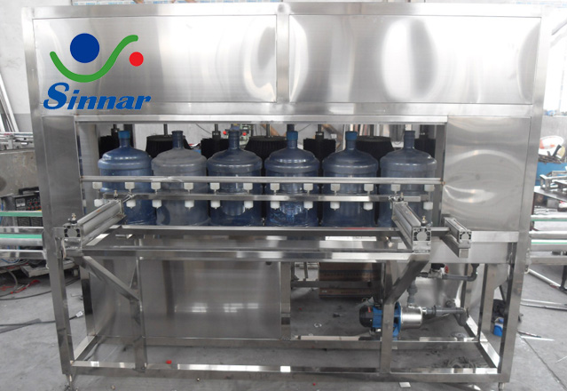桶在輸送帶的輸送力作用下,進(jìn)入外桶清洗機(jī),并與主旋轉(zhuǎn)毛刷貼緊。主旋轉(zhuǎn)毛刷運(yùn)轉(zhuǎn)方向和桶的行進(jìn)方向及桶底部旋轉(zhuǎn)毛刷反向回轉(zhuǎn)。桶在撥輪盤的作用下完成了公轉(zhuǎn)一周、自轉(zhuǎn)四周的復(fù)合運(yùn)動(dòng)。沖洗水泵不斷地向各毛刷噴水或清洗劑,并由下部的接水盤收集后進(jìn)入清洗劑水箱供循環(huán)使用。桶在外桶清洗機(jī)內(nèi)經(jīng)過270°,公轉(zhuǎn)后進(jìn)入噴淋室,經(jīng)噴淋沖洗后由輸送帶輸出。噴淋室內(nèi)的噴淋水或清洗劑來自同一臺(tái)沖洗水泵,由下部的接水盤收集后進(jìn)入同一只清洗水箱供循環(huán)使用。 |