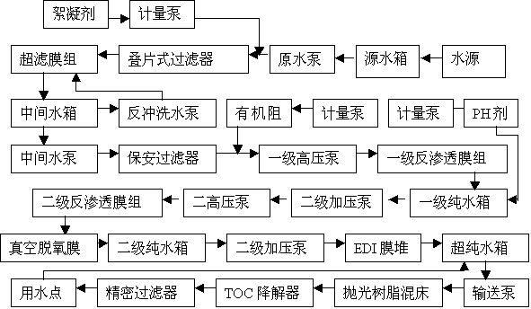 - 電子級超純水處理系統采用多介質過濾器、活性炭過濾器作及保安過濾器作為前級處理,有效除去原水中的懸浮物、泥砂、微粒、有機硅膠體、有機物、異味、余氯等雜質,使經過處理后的原水符合反滲透的進水要求,然后進入程控反滲透裝置去除水中的溶解性鹽類物質、細菌、熱源等,然后使用離子交換混床進行深度脫鹽,使產水電阻率達到15~18.2MΩ.cm,后處理采用紫外線殺菌器和精密過濾器隔絕細菌的二次污染,產水可達到國家電子級水的技術指標GB 11446.1-1997。